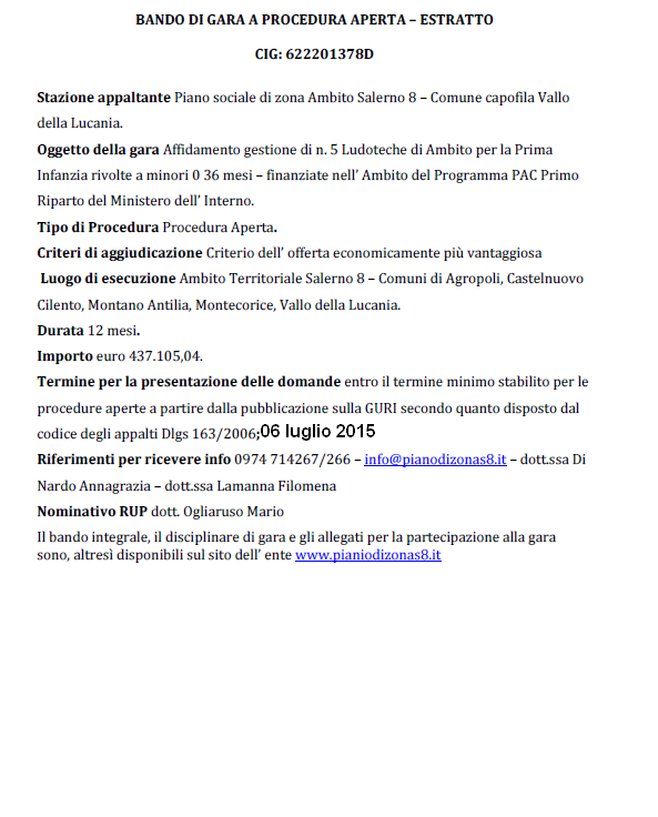 E' stata indetta una gara con procedura aperta per l’affidamento del servizio “Ludoteche per la Prima Infanzia” - Approvato con determina del Coordinatore dell' Ufficio di Piano n°143 del 30/04/2014 – PAC Prima Infanzia – Primo Riparto CIG: 622201378D.